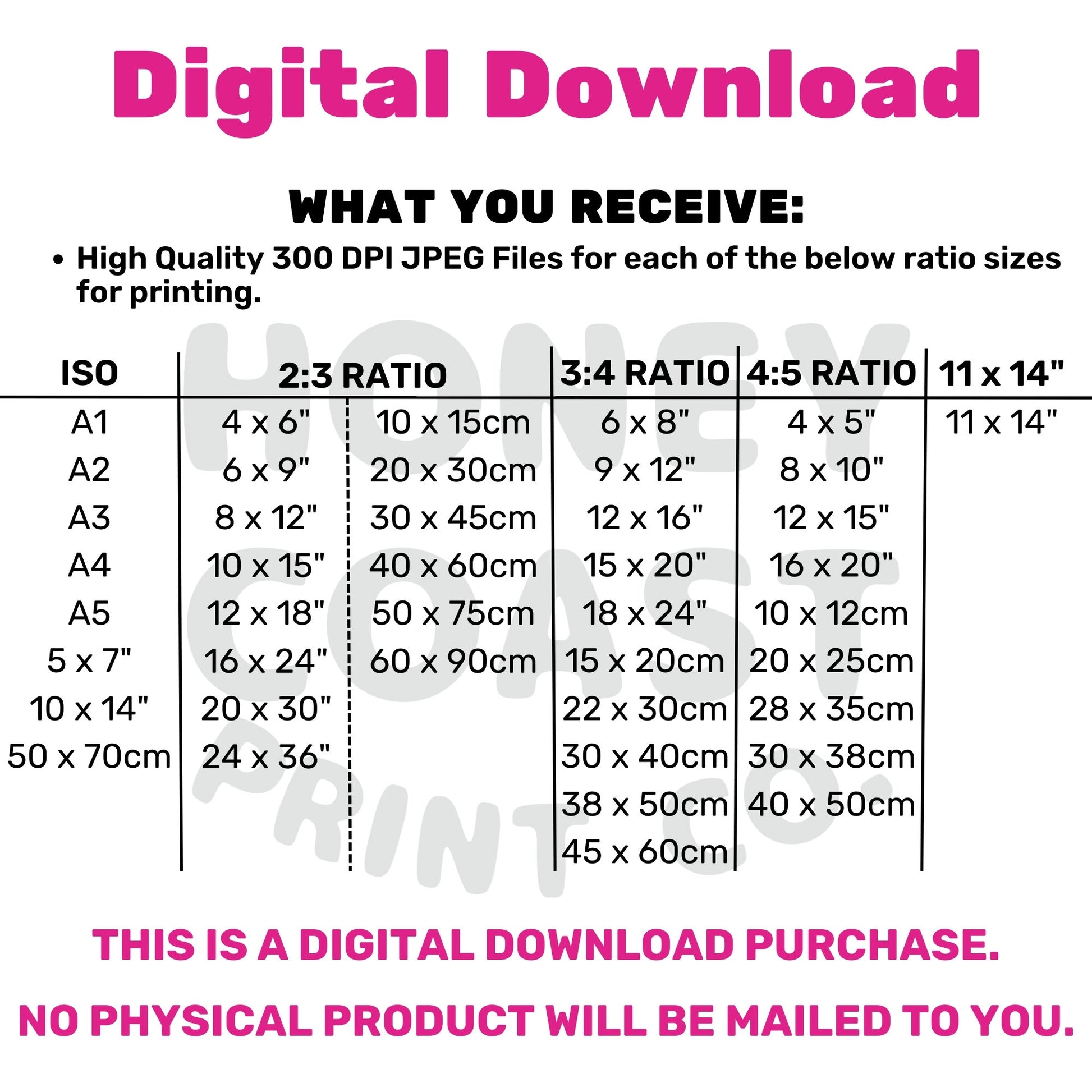 This product is a digital download, which makes it both affordable and instantly delivered! No need to wait for shipping in order to enjoy your purchase. Being an instant download allows you to both print and hang this poster the exact same day. Printing can be done at home or at a local print shop.