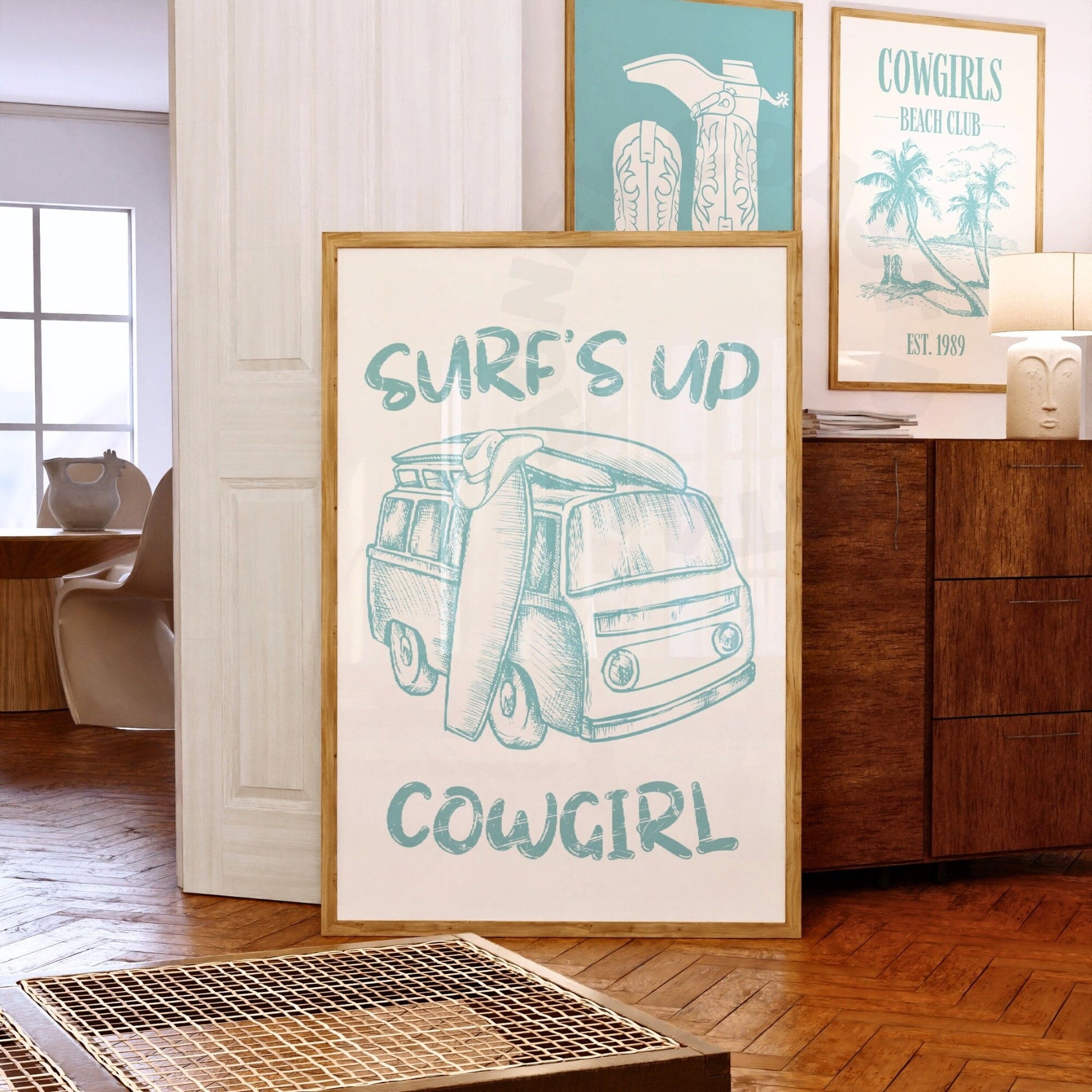 Kick off your cowboy boots and grab your surfboard, we have just the trendy wall print you need to spice up your preppy apartment even more!Coastal Cowgirl Typography digital poster can definitely add some fresh and fun coastal cowgirl flair to your home, dorm, office, or bar. Everyone knows you work hard, so let's show them you know how to play hard as well!